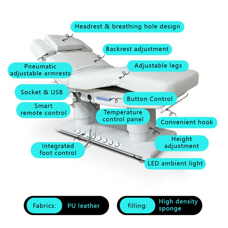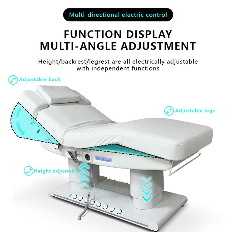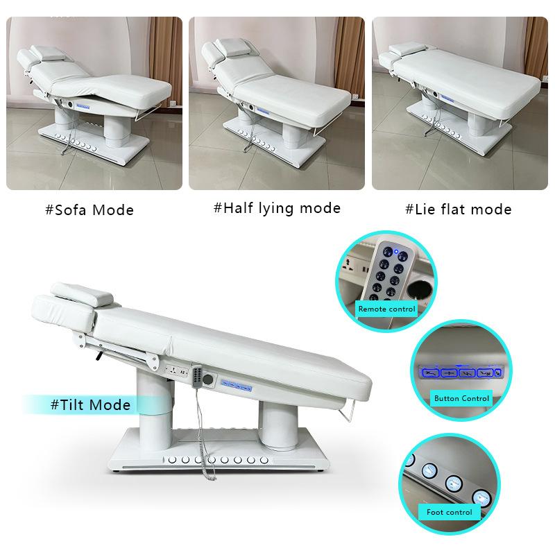The Electric Beauty Massage Bed&Table has four main function: Height Adjustable Function. Legrest Up and Down, Backrest Up and down, overall tilt. It also has foot control and ambient light, towel roller holder.